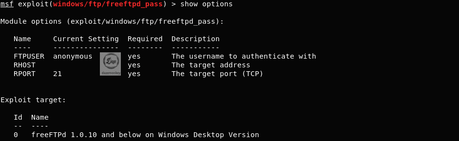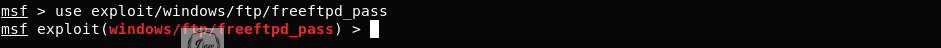 use 명령어로 freeftpd_pass 모듈의 전체 경로를 입력하면 쉘이 msf>에서 msf exploit()>으로 변경된다.