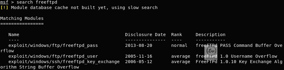 search 명령어로 freeftpd를 검색하면 /usr/share/metasploit-framework/modules 디렉토리에 존재하는 freeftpd 파일을 검색한다. freeftpd 서비스를 공격할 수 있는 모듈이 총 3개 출력된다.