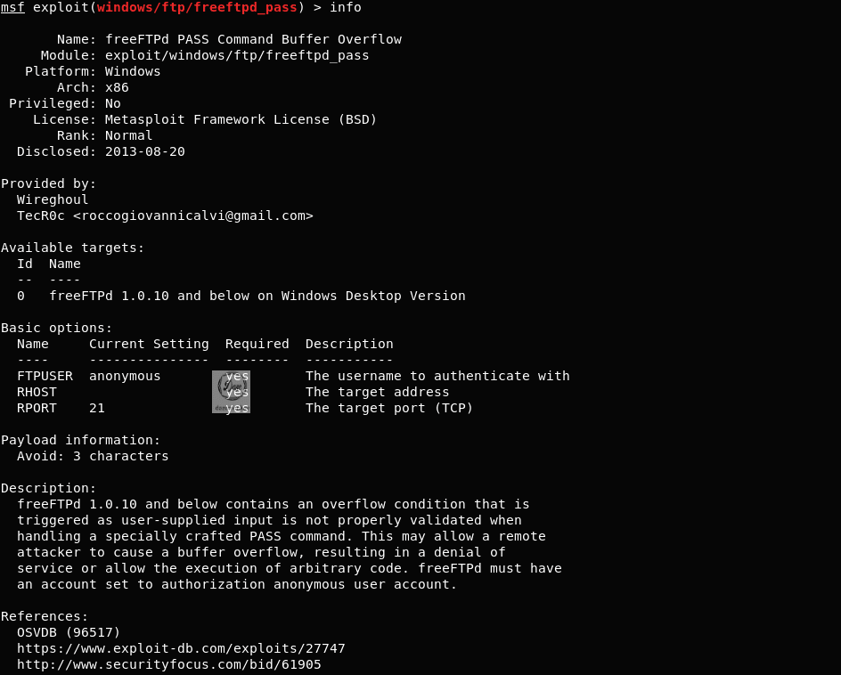 info 명령어를 입력하면 선택한 모듈(freeftpd_pass)의 이름, 모듈 경로, 공격 대상 시스템, 출시 날짜, 저자, 옵션, 설명 등의 상세한 정보가 출력된다.