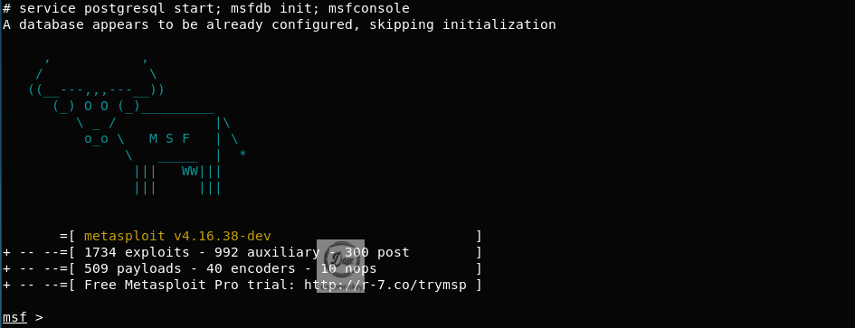 ○ service postgresql start; msfdb init; msfconsole