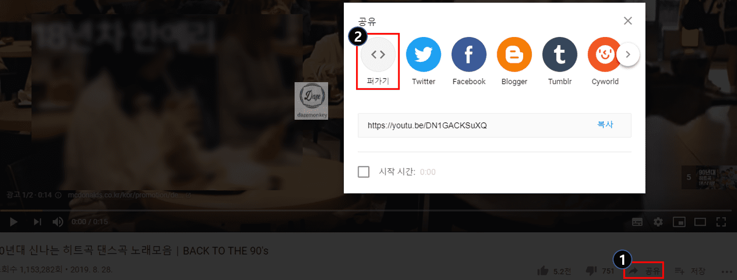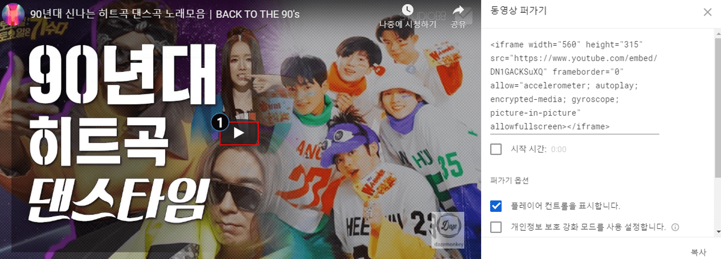퍼가기 버튼을 클릭하면 소스코드를 복사해서 이용할 수 있는 창이 뜨는데, 광고를 제거할 목적이므로 재생 버튼을 클릭한다.