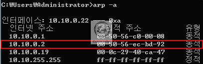 공격이 진행되기 전 희생자의 ARP 테이블을 보면 게이트웨이의 MAC(Media Access Control) 주소가 00-50-56-ec-bd-92이다.