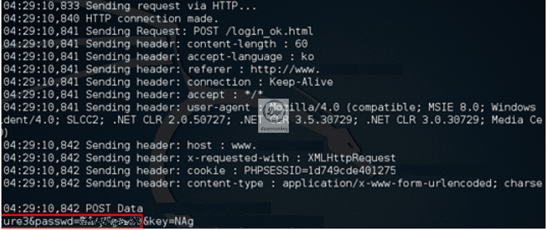 희생자가 계정 정보를 입력하면 HTTP로 공격자 서버에 전달이 되고, sslstrip.log 파일을 보면 계정 정보가 평문으로 저장된다.