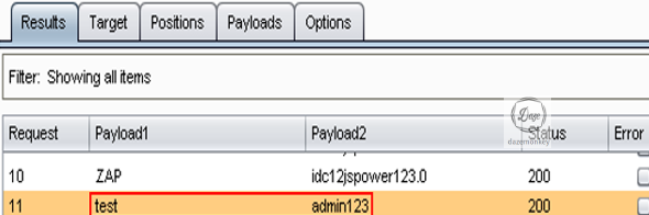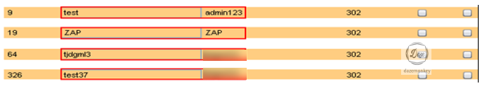 단순하게 설정되어 있는 패스워드 존재 여부를 확인하기 위해 Burp Suite의 Intruder를 이용하여 취약점 진단을 했다. 취약점 진단 결과 쉽게 유추 가능한 test계정, admin123 패스워드가 사용된다.