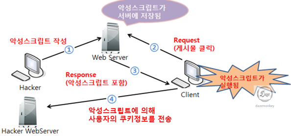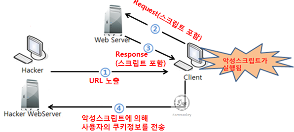 | 1. 공격자가 XSS 취약점이 존재하는 웹페이지에 스크립트를 작성 2. 사용자는 공격자가 작성한 게시물을 클릭 3. 사용자PC의 제어권을 공격자 서버로 전송 4. 사용자PC를 C&C로 이동 5. 공격자가 C&C에게 명령 하달 6. 사용자의 개인 정보 탈취 |