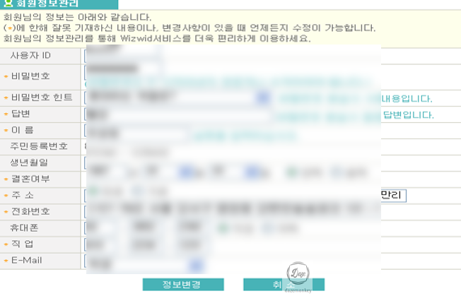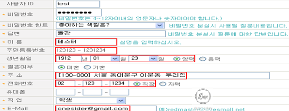 | 파라미터 정보 | user_id,passwd,passwd_q,passwd_a,Name,birth_yy,birth_mm,birth_dd,birth_gbn, ismarry,address,tel1_1,tel1_2,tel1_3,whereTel1,hp2,job,email |