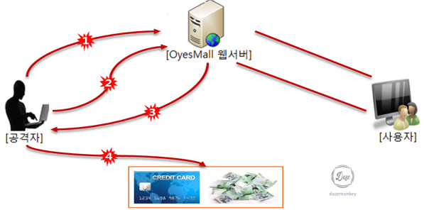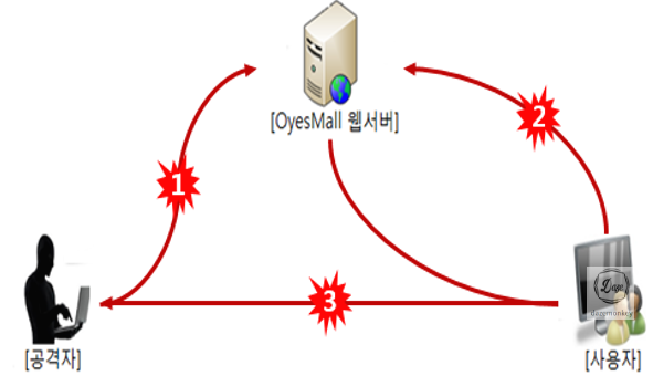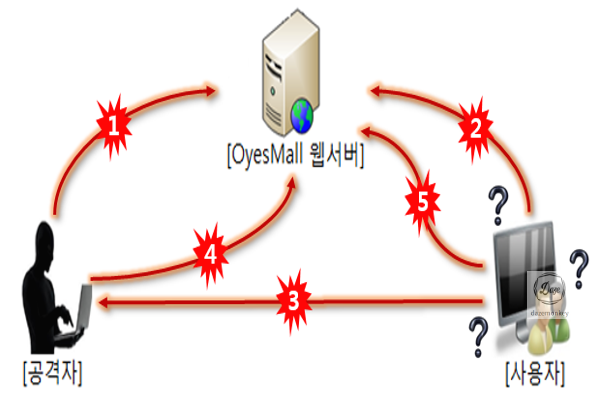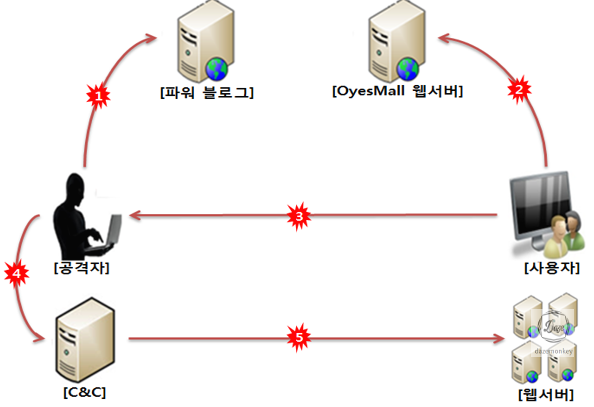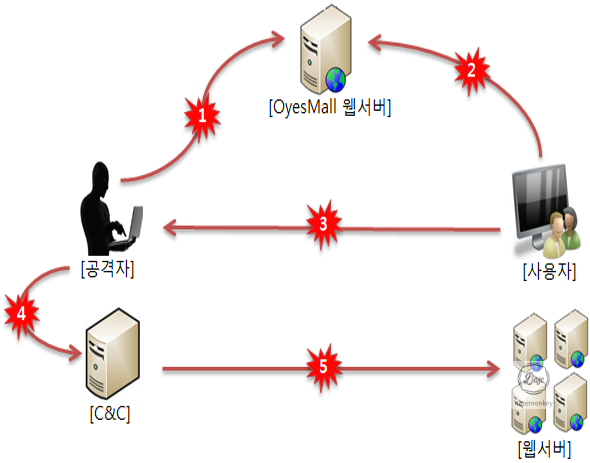 | 1. 공격자는 파워 블로그를 운영 -> 파워 블로그에 OyesMall URL 노출 2. 사용자는 URL를 클릭 -> OyesMall 쇼핑몰 이동 3. 사용자PC의 제어권을 공격자 서버로 전송 4. 사용자PC를 C&C로 이동 5. 공격자가 C&C에게 명령 하달 6. 사용자의 개인 정보 탈취 |