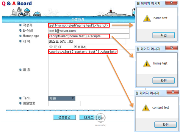Q&A 게시판에 단순히 경고창만 출력되는 스크립트를 작성하고, 해당 게시물을 클릭하면 XSS 취약점이 발생한 파라미터들은 사용자의 브라우저에 경고창을 출력한다.
