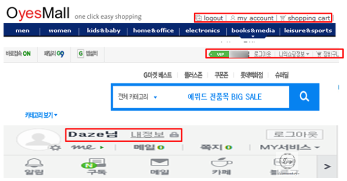 웹 브라우저 창을 닫고 다시 실행한 후 OyesMall 쇼핑몰 웹 사이트로 접속을 하면 로그인을 하지 않았는데, 자동으로 로그인이 된다.