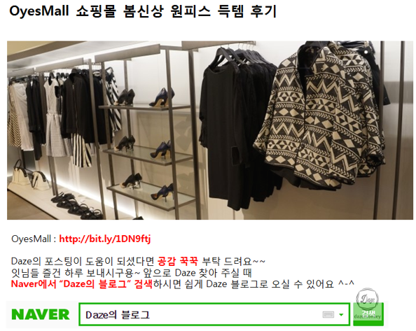 공격자는 자신의 파워 블로그에 OyesMall 쇼핑몰 봄신상 원피스 득템 후기라는 글을 작성한다.