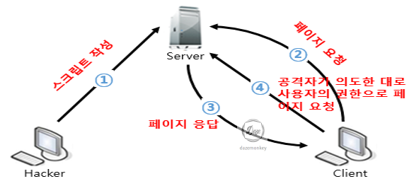 공격자가 작성한 게시물을 사용자가 클릭하면 사용자의 브라우저에 악성 스크립트가 실행되고, 실행된 악성스크립트에 의해 공격자와 사용자는 세션이 맺어진다.