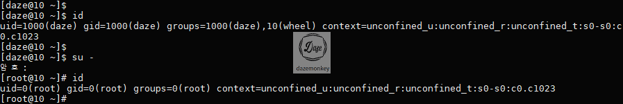 그렇다면 su - daze 명령어를 입력하면 [daze@10 ~]$로 표기된다. daze 사요자로 로그인을 했으니 앞 부분은 daze로 표기되고, ~는 daze 사용자의 홈디렉토리이고, $는 daze가 일반 사용자이니 $로 표기된다.