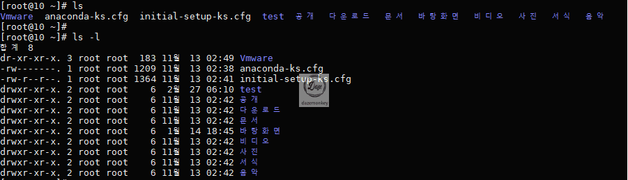root 홈디렉토리에서 ls 명령어를 입력하면 현재 위치한 디렉토리에 존재하는 디렉토리와 파일 이름을 보여준다. ls -l 옵션을 지정하면 현재 위치한 디렉토리에 존재하는 디렉토리와 파일을 구체적으로 보여준다.