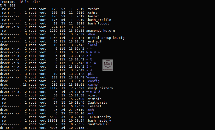ls -altr 명령어를 입력하면 디렉토리의 목록을 최근 작업 파일을 기준으로 정렬해서 보여준다.