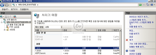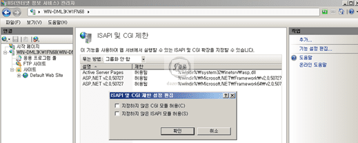 ▷ 시작 > 실행 > inetmgr > 해당 서버 > ISAPI 및 CGI 제한 더블 클릭