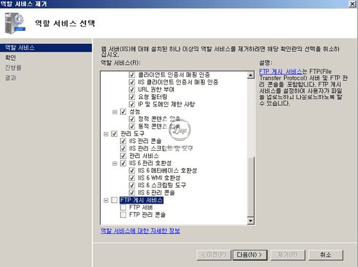 ▷ 하단의 FTP 게시 서비스 체크 해제 > 다음 > 제거