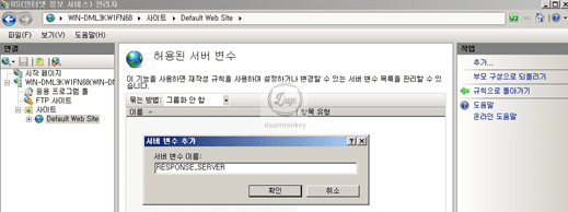 ▷ 허용된 서버 변수에서 마우스 우측 클릭 > 추가 > 서버 변수 이름 : RESPONSE_SERVER > 확인