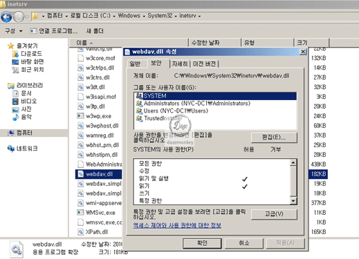 ▷ 내 컴퓨터 > C:\WINDOWS\system32\inetsrv\webdav.dll> 속성 > 보안 탭 > Everyone 선택 > 제거