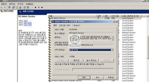 ▷ IIS Admin Service 더블 클릭 > 일반 탭 > "시작 유형 : 사용 안 함", 서비스 상태 : 중지(T) > 확인 (IIS 종속된 모든 서비스 중지됨)