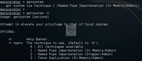 이런 수동적인 과정 없이 자동으로 시스템 권한으로 상승해주는 getsystem 명령어가 존재한다. 명령어가 옵션을 지정하지 않으면 알아서 시스템 권한 상승을 한다.