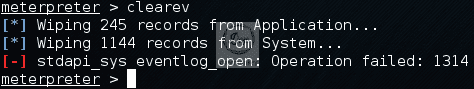 meterpreter shell에서 clearev를 입력하면 희생자 시스템의 로그가 삭제된다. 실제로 삭제되었는지 확인하려면 대상 시스템에서 시작 > 실행 > eventvwr 명령어를 입력하면 된다.