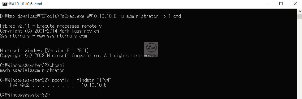 로컬 시스템에서 원격 시스템의 쉘을 획득하려면 psexec.exe [\\원격IP] -u [사용자 계정] -p [사용자 패스워드] [실행 명령어] 형식으로 입력하면 된다. 해당 명령어를 정상적으로 입력하면 원격 시스템의 Administrator 계정의 쉘이 획득된다.