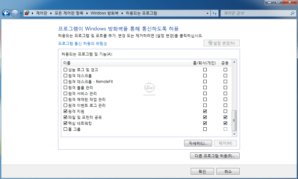 시작 > 제어판 > Windows 방화벽 > 허용되는 프로그램 > 파일 및 프린터 공유 항목에 체크를 하면 TCP 445 포트가 활성화 된다.