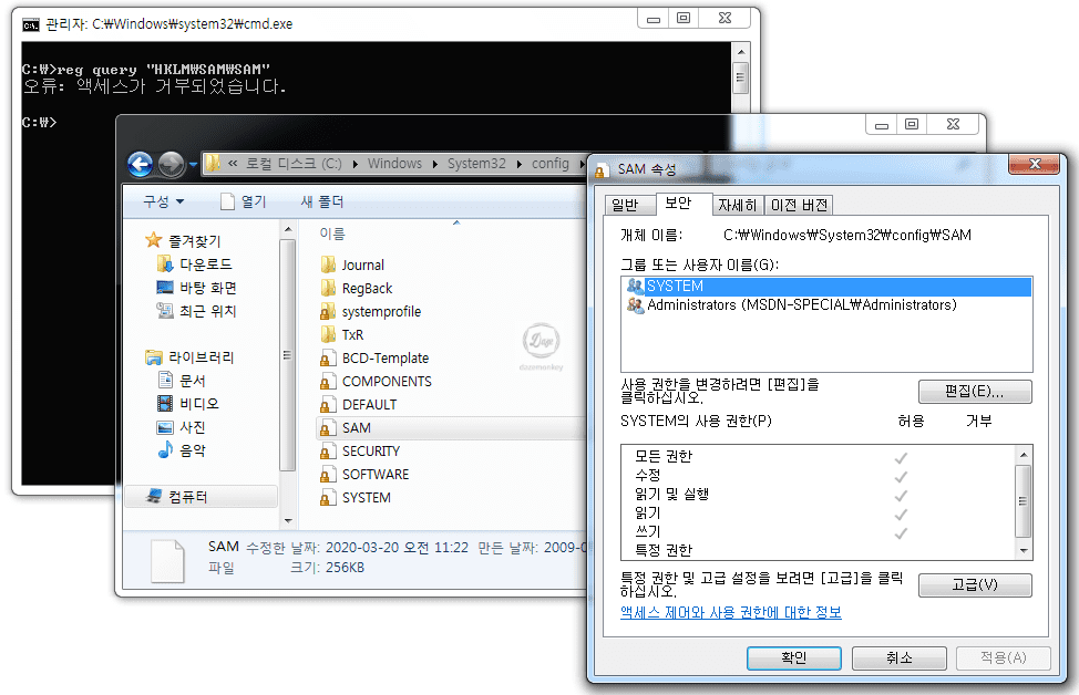 실습 환경은 윈도우7의 Administrator 계정으로 로그인을 한 상태인데, SAM 정보가 저장된 레지스트리 쿼리(HKLM\SAM\SAM)를 조회하면 접근이 거부 메시지가 출력된다.