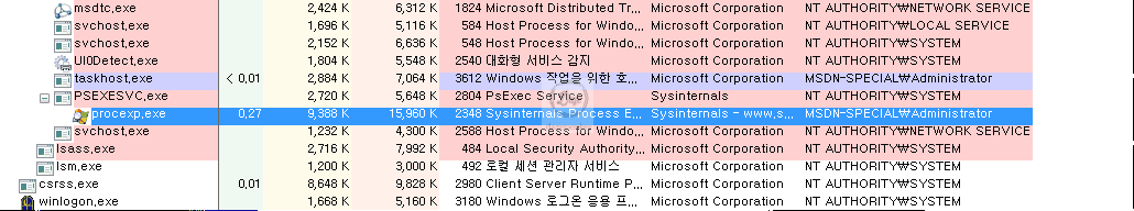 원격 시스템에서 현재 실행중인 프로세스 정보를 보면 psexec.exe 자식 프로세스로 procexp.exe 프로세스가 동작한다. 해당 프로세스의 아이디를 보면 2348로 상기 이미지의 프로세스 아이디와 동일하다.