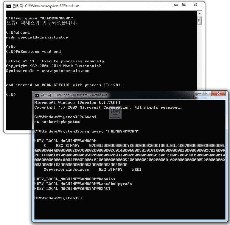 psexec.exe를 실행 시 옵션으로 -sid, 실행할 명령어를 cmd를 지정하면 새로운 프로세스에 시스템 권한의 쉘이 생성된다. 시스템 권한의 쉘이 생성되었으므로 SAM 레지스트리 쿼리를 조회하면 SAM 파일의 내용이 해시 값 형태로 나타난다.