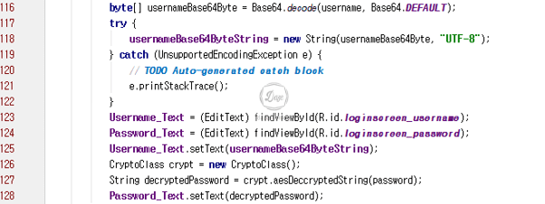 로컬 암호화 취약점은 아이디를 Base64 인코딩하여 저장했으므로 취약점이 발생한다. 사용자가 입력한 중요 정보는 암호화 클래스에서 암호화하도록 처리하고, 암호화 된 중요 정보는 공유 설정 디렉토리에 저장하면 중요 정보가 유출되더라도 쉽게 복호화가 되지 않는다.