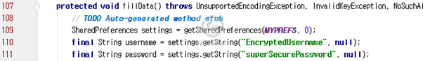 LoginActivity 클래스내의 fillData()를 보면 mySharedPreferences.xml를 settings 변수에 저장 한다. xml 파일에 저장된 EncryptedUsername, superSecurePassword의 값을 각 username, password 변수에 저장한다.