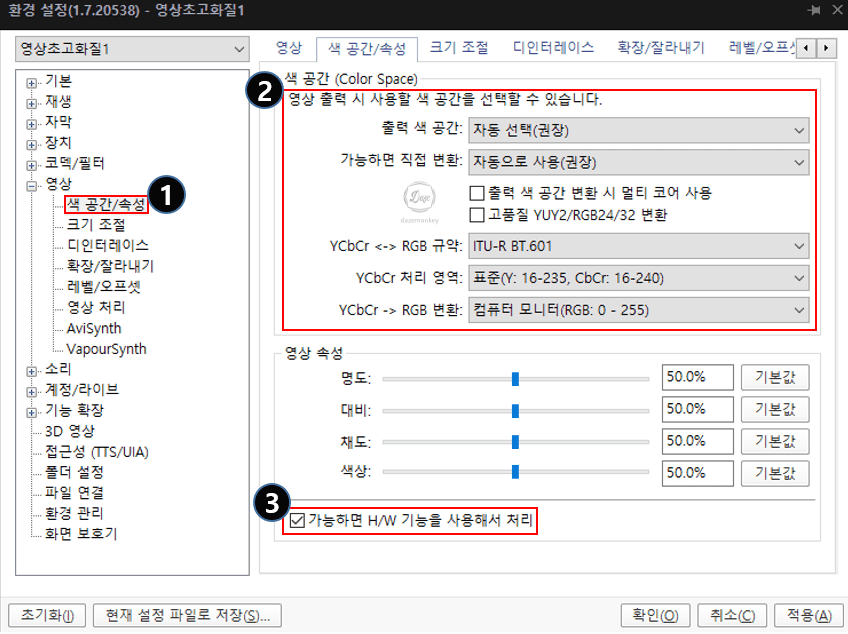 환경 설정 창에서 영상 > 색 공간/속성 버튼을 클릭하고, 색 공간(Color Space)에서 출력 색 공간에 자동 선택(권장), 가능하면 직접 변환 : 자동으로 사용(권장)에 체크를 한다.