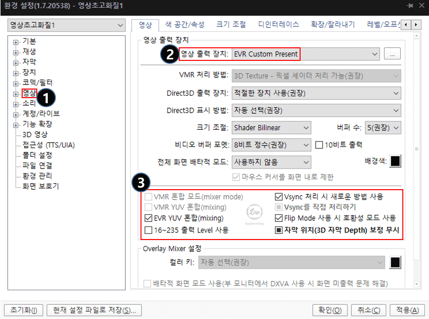EVR Custom present는 하드웨어 가속이 잘 되기 위한 설정이다. 만약, 메뉴의 차이가 존재한다면 스크린샷 설정과 동일하게 해도 무관하다.
