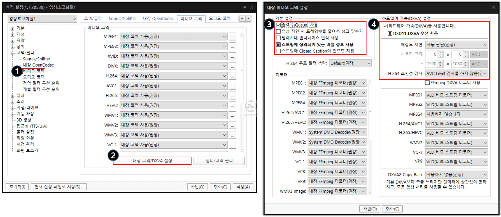 기본 설정에서 출력큐(Queue) 사용에 체크를 하고, 하드웨어 가속(DXVA) 설정에서 하드웨어 가속(DXVA)을 사용합니다, 해상도 제한 : 자동 판단(권장), H.264 호환성 검사 : AVC Level 검사를 하지 않음(권장)에 체크를 한다.