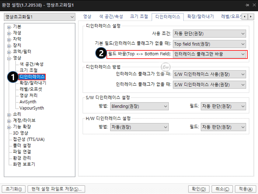 환경 설정 창에서 영상 > 디인터레이스 버튼을 클릭하고, 디인터레이스 설정에서 필드 바꿈(Top <-> Buttom Field) : 인터레이스 플래그만 바꿈에 체크를 한다.