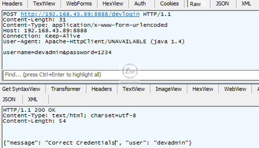 패킷을 보면 요청 패킷에 아이디와 비밀번호를 /devlogin 주소로 전달하고, 응답 패킷에 devadmin 계정으로 인증이 성공했다는 메시지를 전달 받는다.