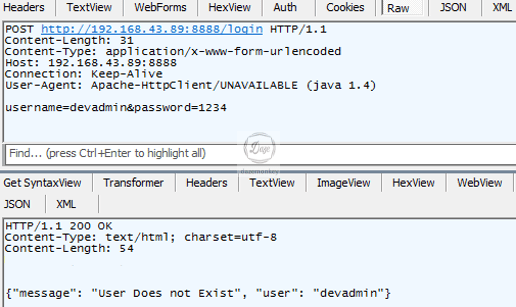 모바일 앱을 실행하여 devadmin 아이디와 임의의 비밀번호를 입력하고, 로그인 버튼을 클릭했을 때 패킷을 캡처한다.