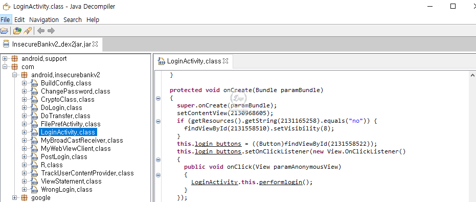 안드로이드 앱은 소소코드 보호를 하려고 난독화를 적용한다. jadx-gui 도구에서 100% 완벽한 수준으로 난독화 해제를 할 수는 없지만 어느 정도 알아보기 쉽게 해제할 수 있다.