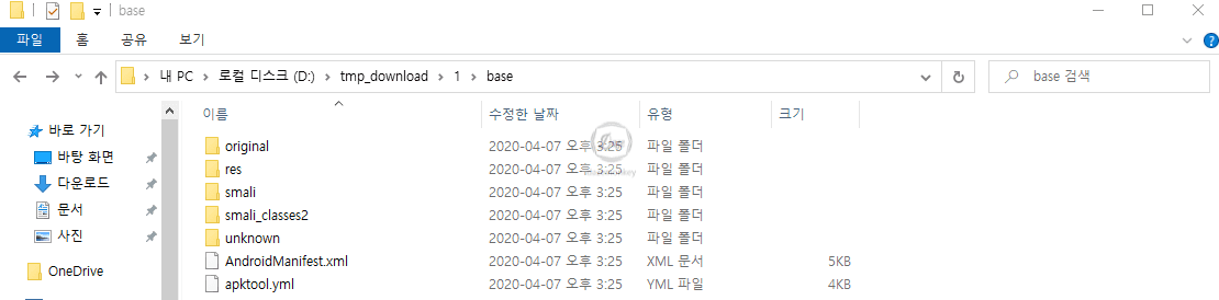 디컴파일을 하면 기계어 코드로 구성된 classes.dex 파일을 사람이 알아보기 쉽게 소스코드 형태로 변환하여 res, smali, AndroidManifest.xml 등의 파일이 생성된다.