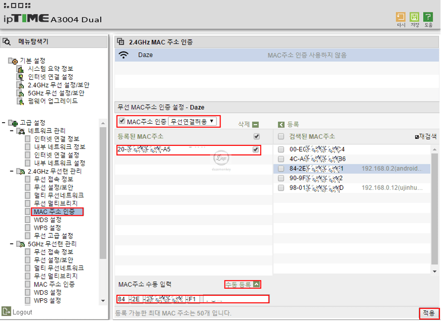 3. 등록된 MAC 주소를 보면 허용할 무선 단말기의 MAC 주소가 보임