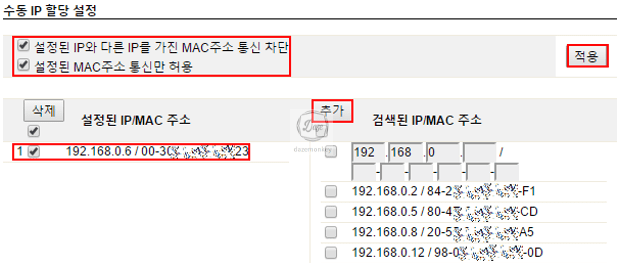 1. 허용할 MAC 주소에 대응되는 아이피 주소를 추가하면 설정된 IP/MAC 주소에 등록됨 > 적용
