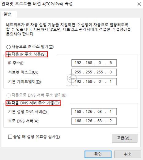 3. 다음 IP 주소 사용, 다음 DNS 서버 주소 사용을 다음과 같이 설정