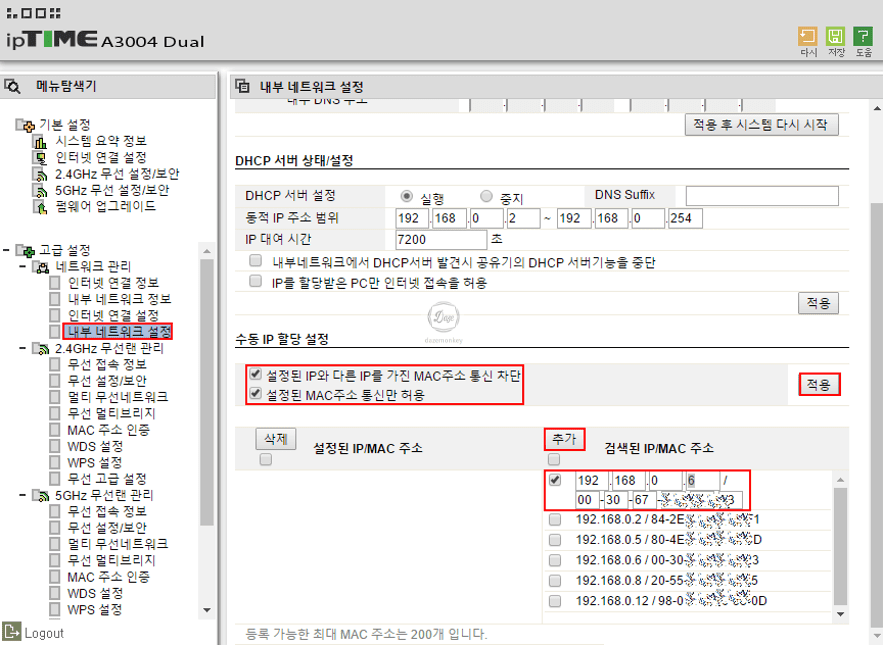 2. 수동 IP 할당 설정 > 설정된 IP와 다른 IP를 가진 MAC주소 통신 차단(v), 설정된 MAC 주소 통신만 허용(v) > 적용