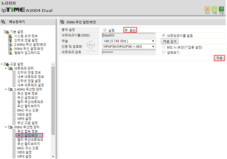 회사에서 2.4 GHz, 5 GHz 모두 사용한다면 모든 채널에 MAC 주소 필터링을 해야 한다. 만약, 5GHz를 사용하지 않는다면 "관리자 페이지 접속 > 고급 설정 > 5 GHz 무선랜 관리 > 무선 설정/보안 > 동작 설정 : 중단 > 적용"을 하면 된다.