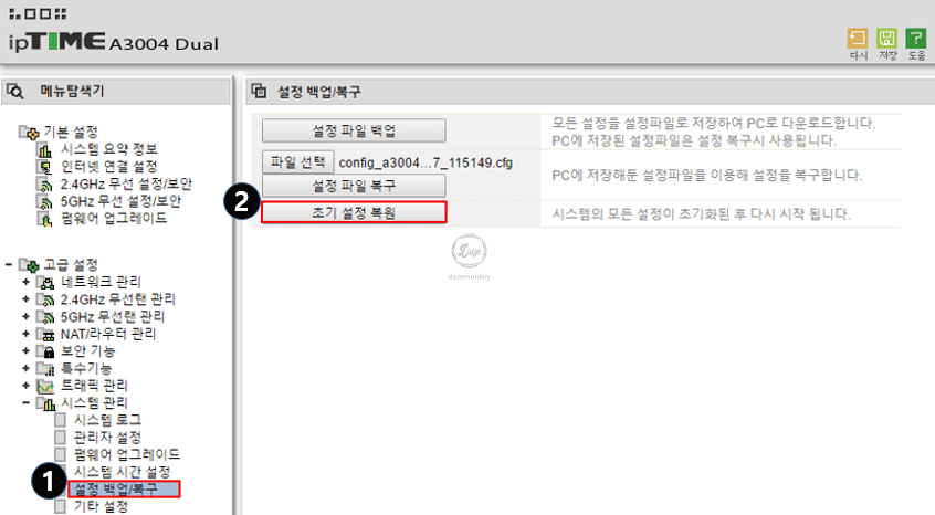 공유기의 설정 값이 잘못 변경되어 있고, 설정 파일을 백업하지 않은 상태이면 최후의 수단으로 초기화를 해야 한다. 만약, 관리자 페이지에 접속이 가능한 경우 초기 설정 복원 버튼을 클릭하면 초기화가 진행된다.