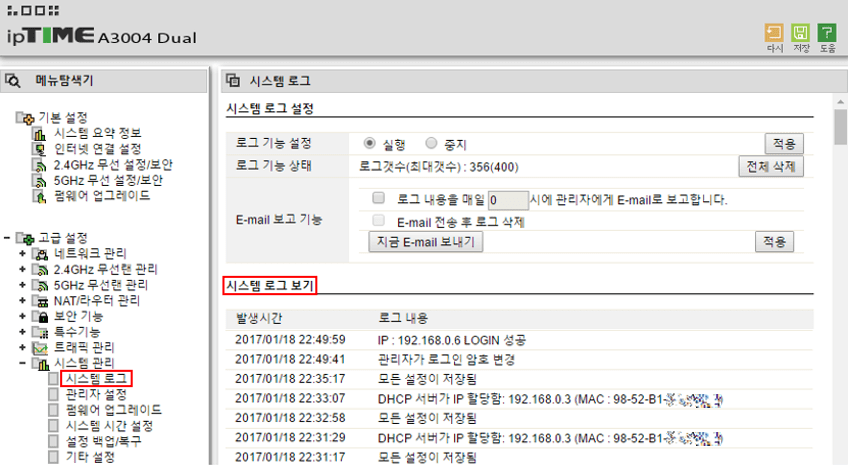 유무선 공유기의 관리자 페이지는 시스템 로그, 내부 네트워크 로그, 네트워크 감시 로그, 호스트별 커넥션 로그 등 다양한 로그를 제공한다.